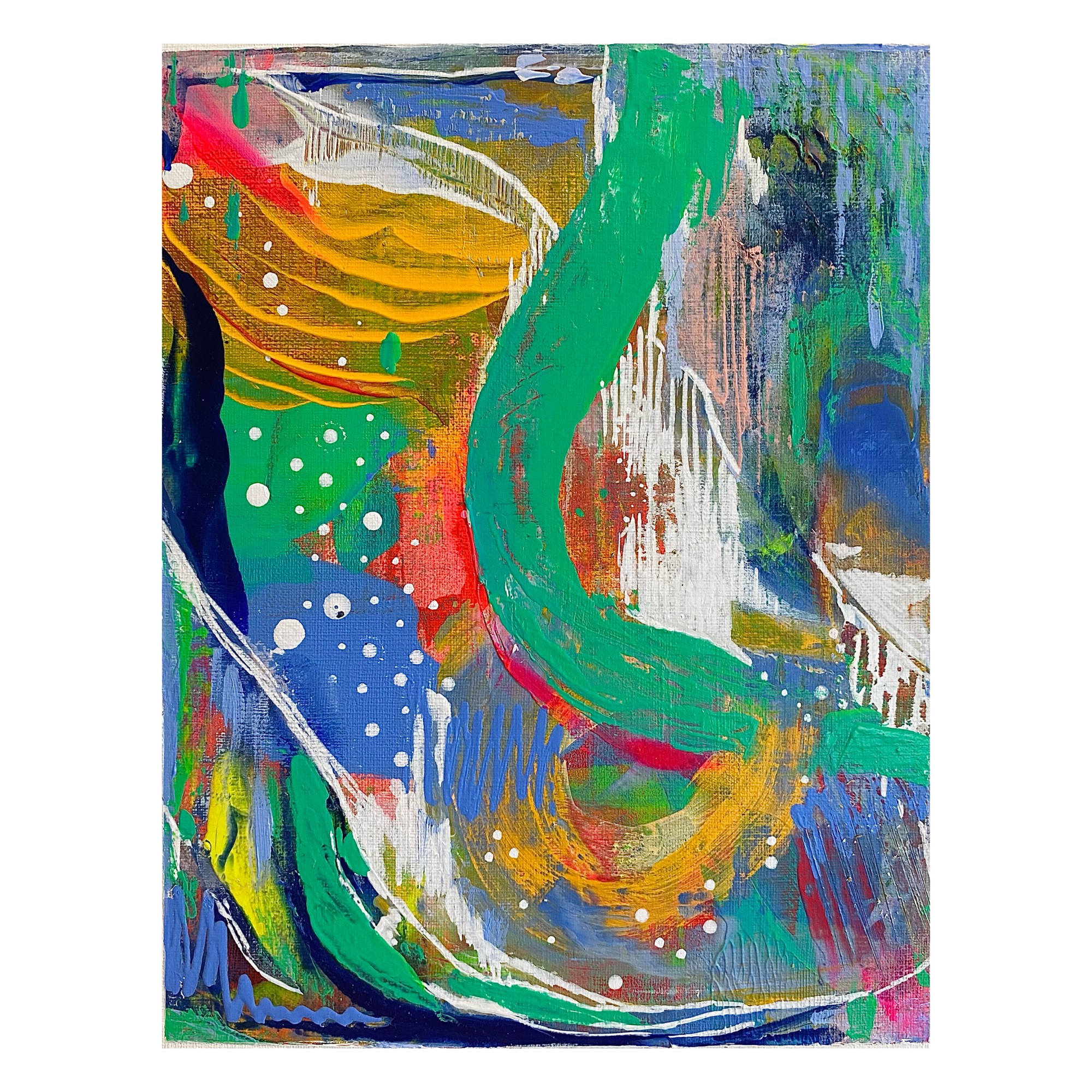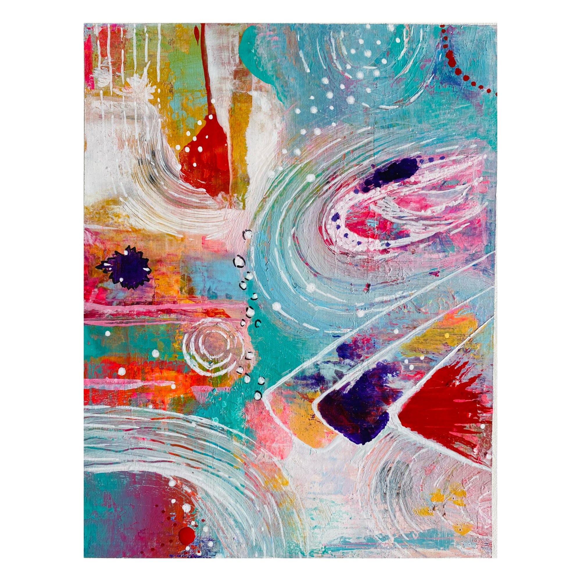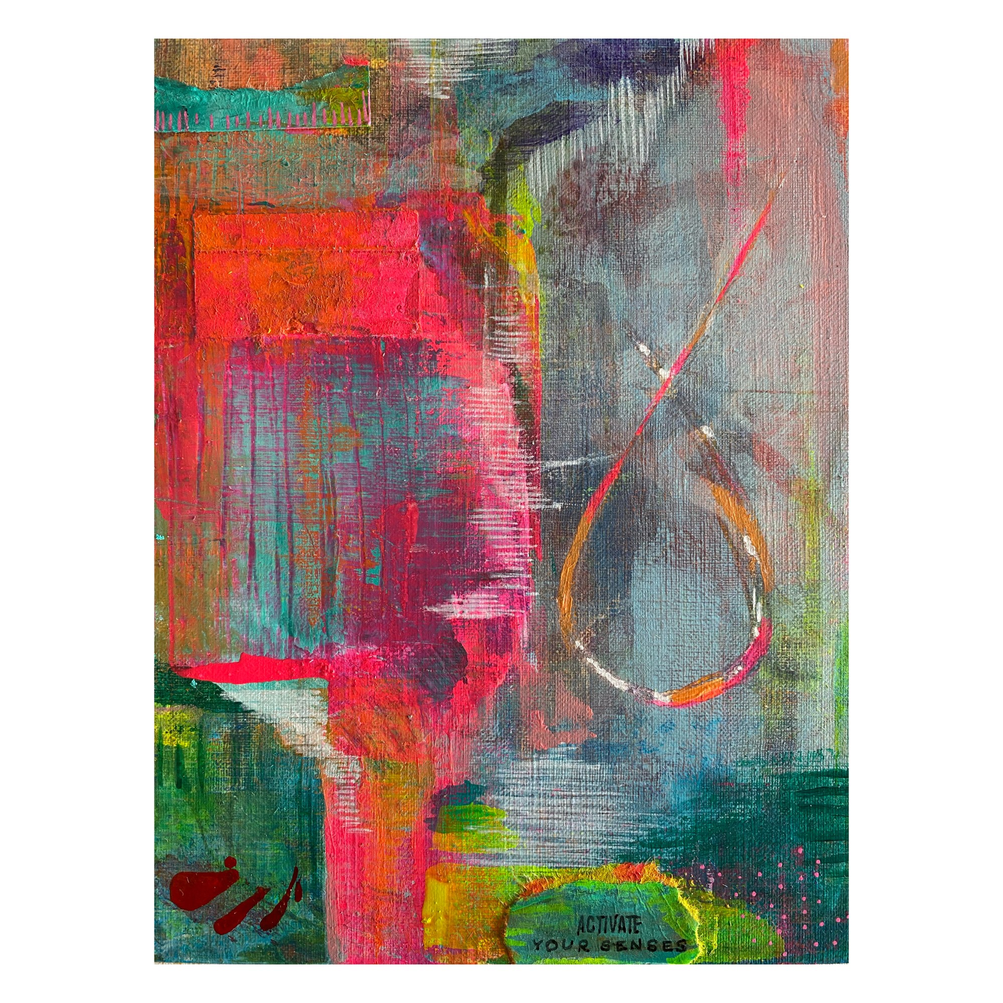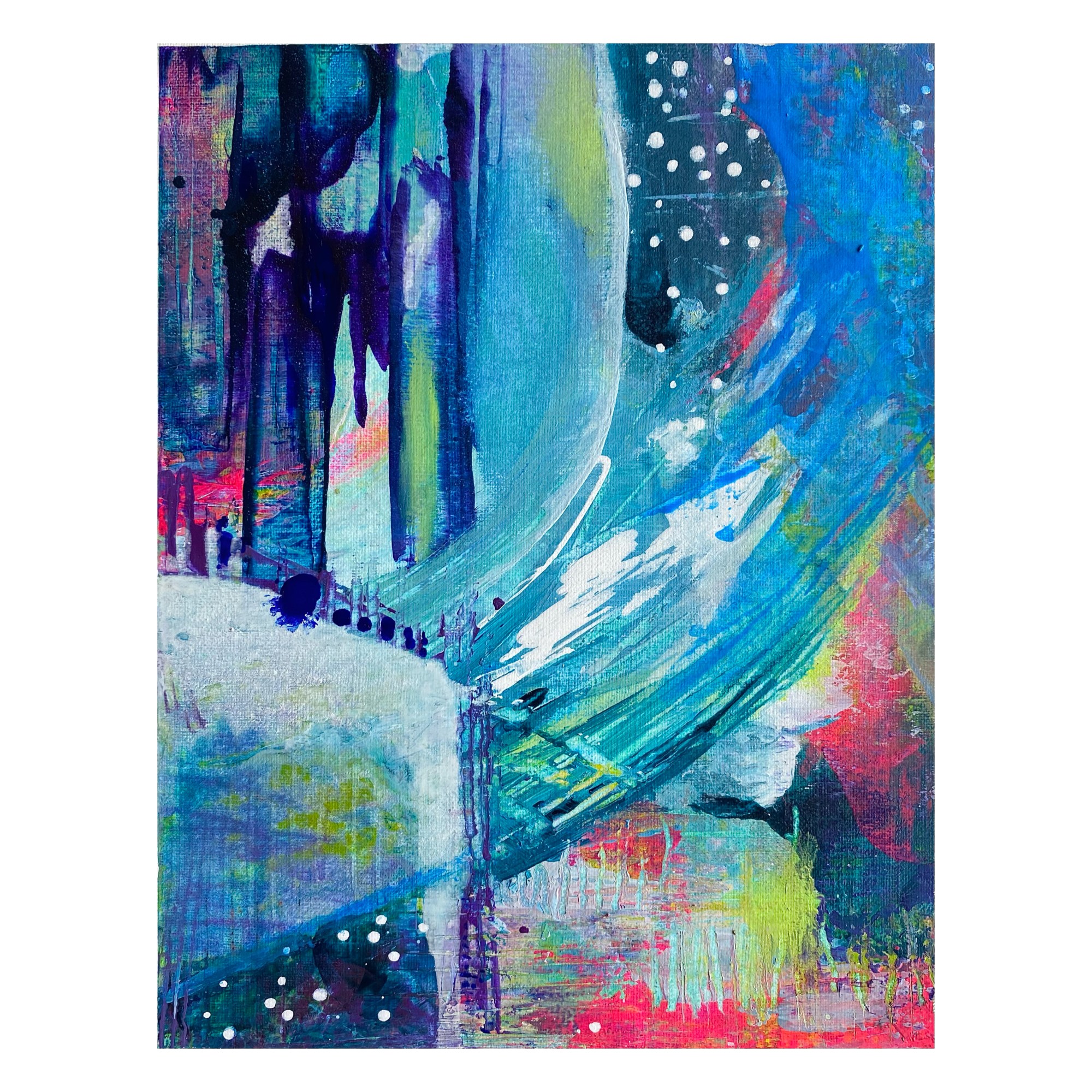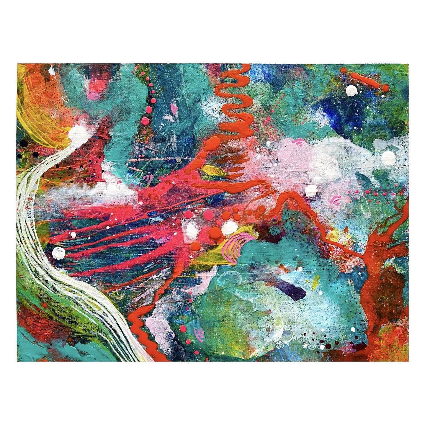 Not having a plan in mind, I follow the colours on the page and how they seem to want to interact with each other. It is always a surprise and a revelation to see how they take form! [8×10″, acrylic on artboard]